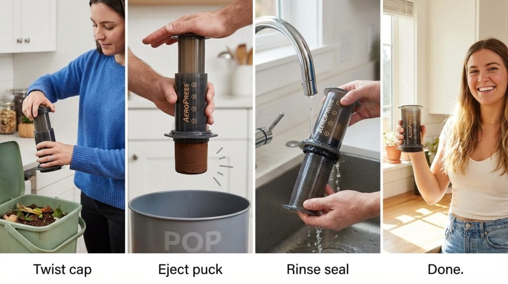 With a deeply satisfying POP, the solid puck of coffee grounds and the paper filter shoot cleanly out of the tube and directly into the trash. There is no scraping. There is no sludge.
