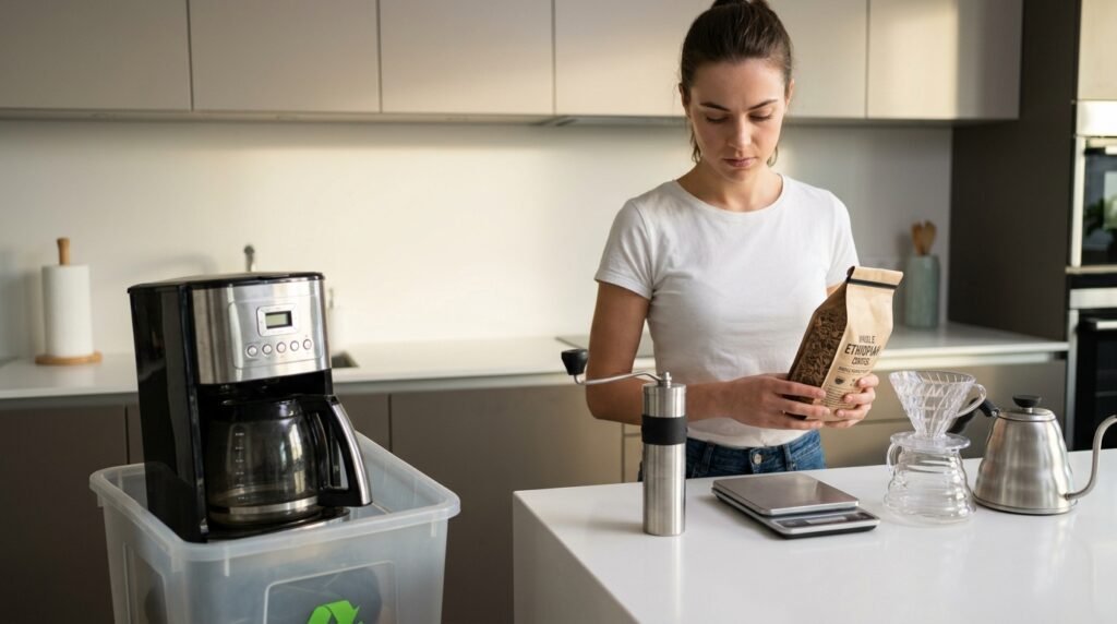 I threw my automatic drip machine into the recycling bin. I went to a specialty store and bought a manual stainless steel burr grinder, a digital kitchen scale, a glass V60 pour-over cone, and a gooseneck kettle.