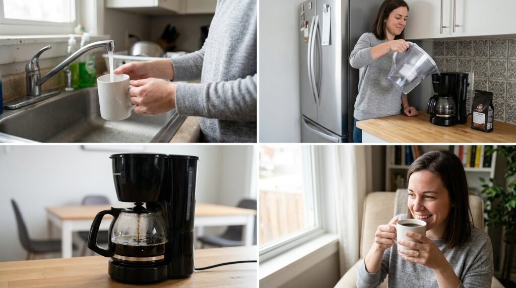 I didn’t buy a new coffee machine. I simply took the basic, inexpensive charcoal water filter pitcher that was already sitting in my refrigerator and started using it for my morning brew.