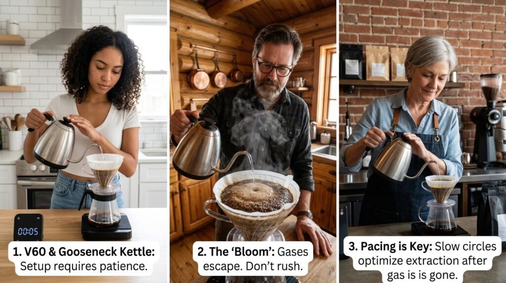 I ground fresh, light-roast Colombian beans with my manual burr grinder. I used filtered water, heated to exactly 200°F. I placed my V60 on my digital scale, locked in my 1:16 ratio, let the coffee bloom, and poured in slow, gentle circles.