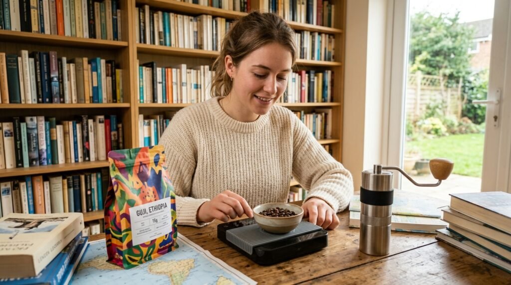 I pulled out a fresh bag of lightly roasted, naturally processed coffee from the Guji region of Ethiopia. This specific coffee was known for having intense, wild flavors of ripe blueberries and milk chocolate.