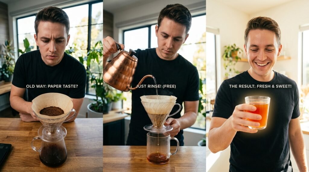 Here is the honest, highly practical story of the simple trick that made my coffee taste better, how a ten-second adjustment completely eliminated the bitter aftertaste in my mug, and why you should never let a dry piece of paper touch your morning brew.