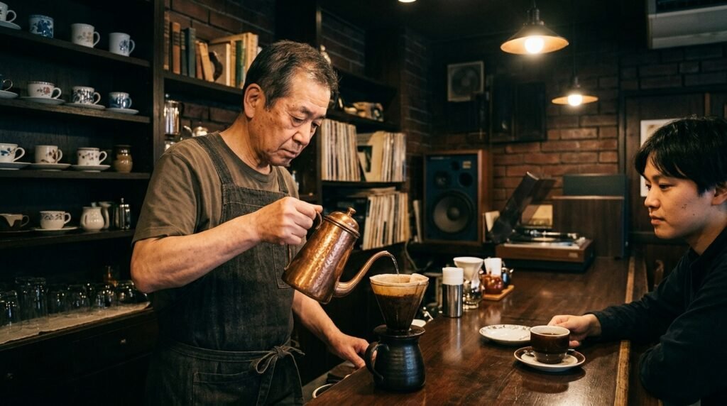 In a Kissaten, you do not ask for a caramel latte to go. You sit in absolute quiet, watching a master pour a thin, precise stream of hot water over heavily roasted, aged coffee beans for five agonizingly slow minutes.