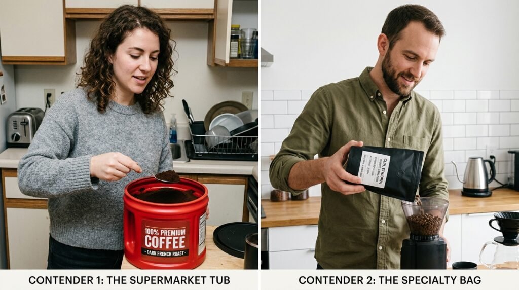 I decided to stop speculating and run a highly unscientific, yet deeply personal, experiment in my own kitchen. I was going to do a blind side-by-side taste test. I bought the cheapest, most generic tub of pre-ground dark roast I could find. Then, I went to a local specialty roaster and bought a premium, single-origin, freshly roasted bag of whole beans.