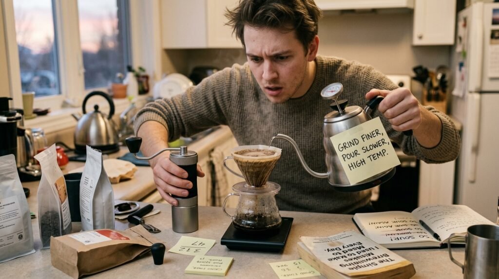 If I woke up, brewed a V60 pour-over, and it tasted aggressively sour and weak, I would panic. The next morning, I would try to fix it by grinding the coffee finer, pouring the water slower, and increasing the temperature of my kettle all in one single session.