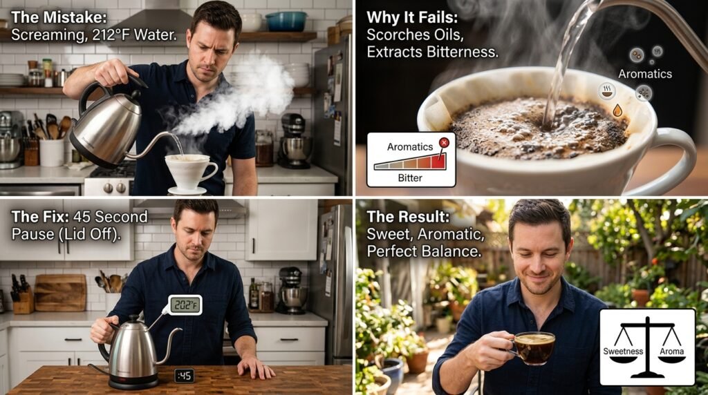 Water at a rolling boil (212°F or 100°C) contains maximum kinetic energy. It is an incredibly aggressive solvent. When you hit coffee grounds with water that hot, the heat instantly vaporizes the delicate, volatile floral and fruit aromatics, sending them into the air instead of your cup.