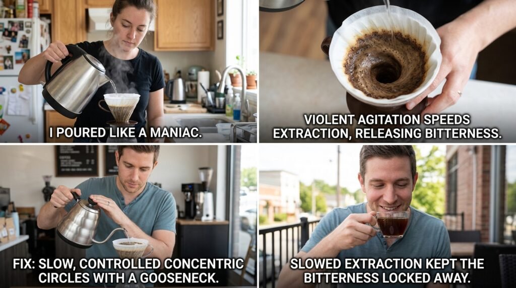 The Fix: I bought a gooseneck kettle. The thin, precise spout naturally restricts the flow of water. I learned to pour incredibly slowly, drawing gentle, controlled concentric circles over the coffee bed. I stopped swirling the brewer aggressively. By treating the coffee bed gently, I slowed down the extraction rate, keeping the bitter compounds locked safely away.